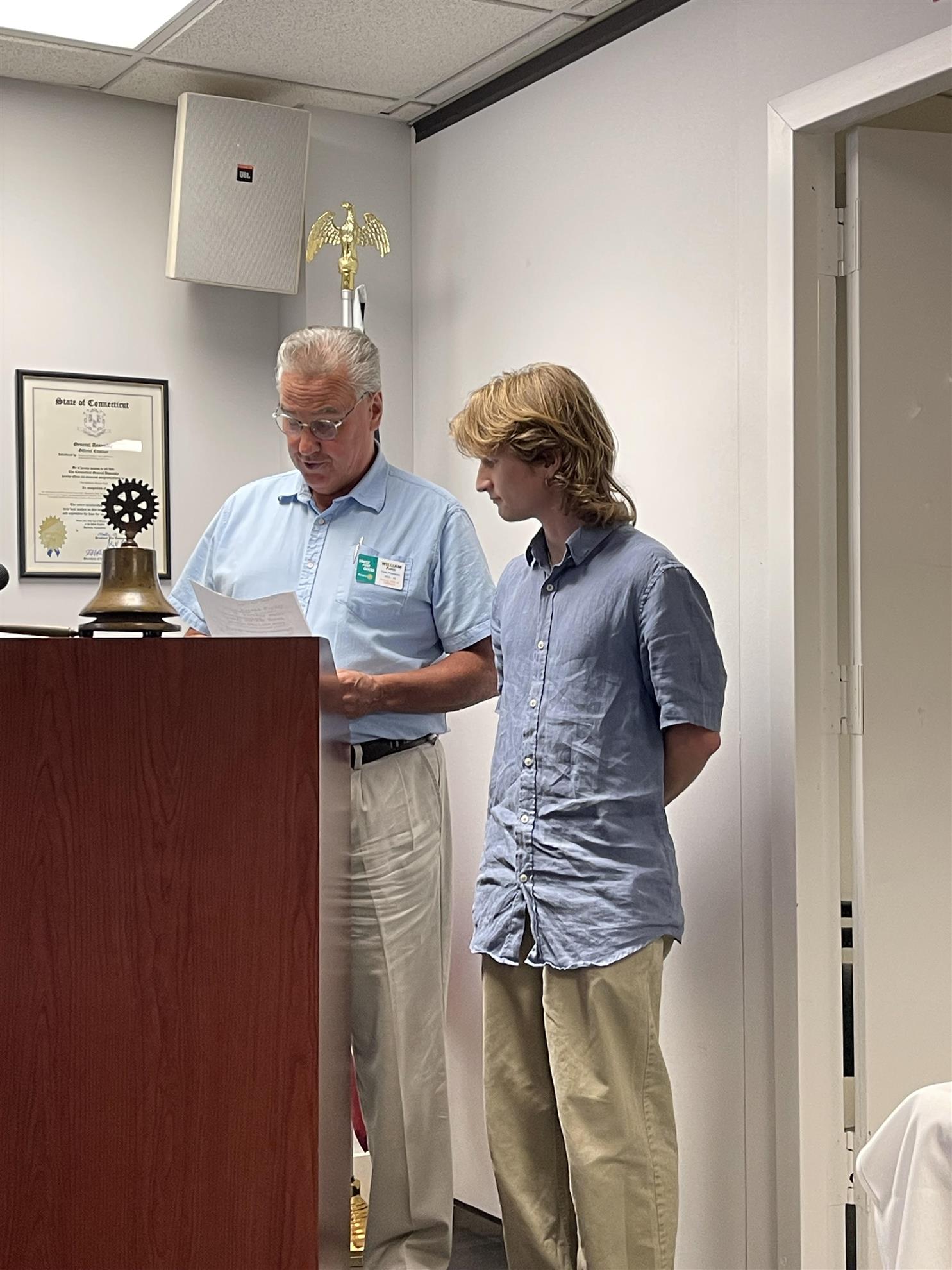 President Bill Pond presenting this year's recipient of the Bob Estabrook Scholarship for the Lakeville Journal to David Carley of Norfolk.